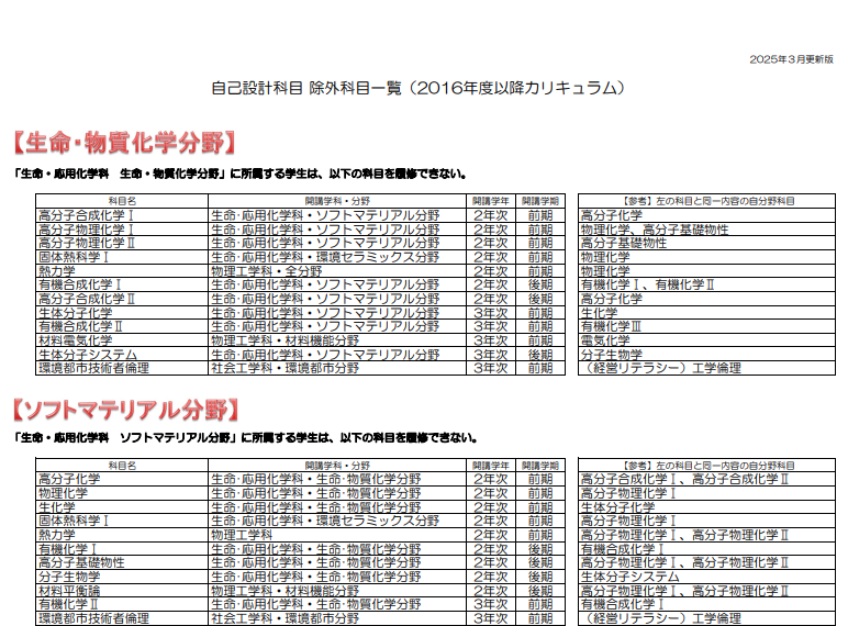 | 専門科目/生命・応用化学科 | 専門科目/物質工学科 |